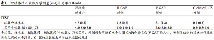 表格1为临床测量的结果。拔牙窝的尺寸是4.7±0.5mm,即刻种植后水平骨缺损(H-GAP)和垂直骨缺损(V-GAP)分别是1.2±0.3mm和3.1±1.3mm,IS在舌侧骨边缘嵴根方约0.7mm的位置。